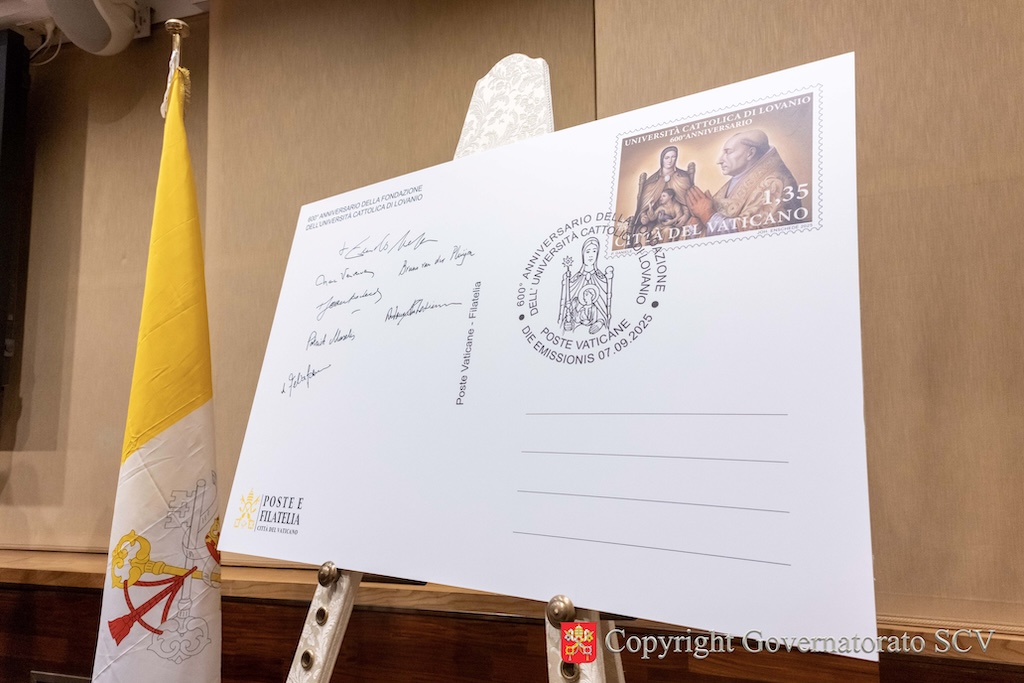 A completare l’iniziativa, anche un annullo postale commemorativo, elaborato partendo dallo stemma ufficiale fornito dall’Ambasciata del Belgio presso la Santa Sede. Al centro dell’annullo, a forma circolare e con un diametro di 38 mm, campeggia nuovamente la figura della Vergine Maria nella sua veste di Sedes Sapientiae, accompagnata dalle diciture: “600° anniversario della fondazione dell’Università Cattolica di Lovanio”, “Poste Vaticane” e “Die Emissionis 07.09.2025”.