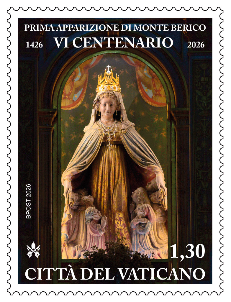 Affianca il francobollo l’annullo speciale “die emissionis”, che riproduce un dettaglio della Madonna della Misericordia. Completano l’annullo le scritte “Prima apparizione di Monte Berico 1426 – 2026”, “Poste Vaticane”, “die emissionis 26.02.2026” e “VI centenario”.