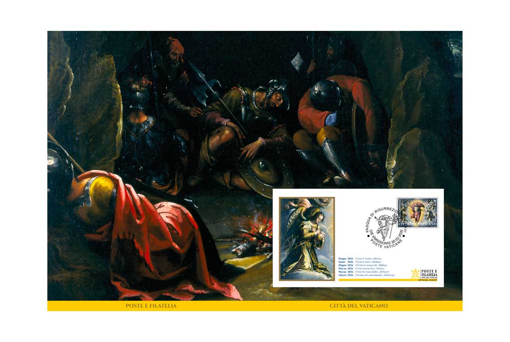 The vignette on the envelope reproduces a detail from the cover painting “Resurrection of Christ” by Passignano, depicting an angel in adoration. The stamp has a value of €1.35, “Easter MMXXVI,” and was issued on February 26, 2026.