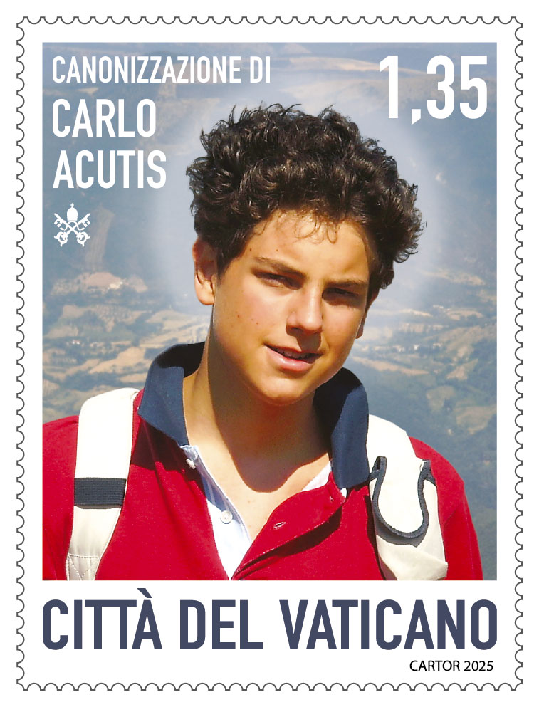 Vignetta: il francobollo riproduce l’immagine tradizionalmente più diffusa di Carlo Acutis, ritratto durante una gita sul Monte Subasio, luogo a lui caro in quanto legato alla memoria francescana.