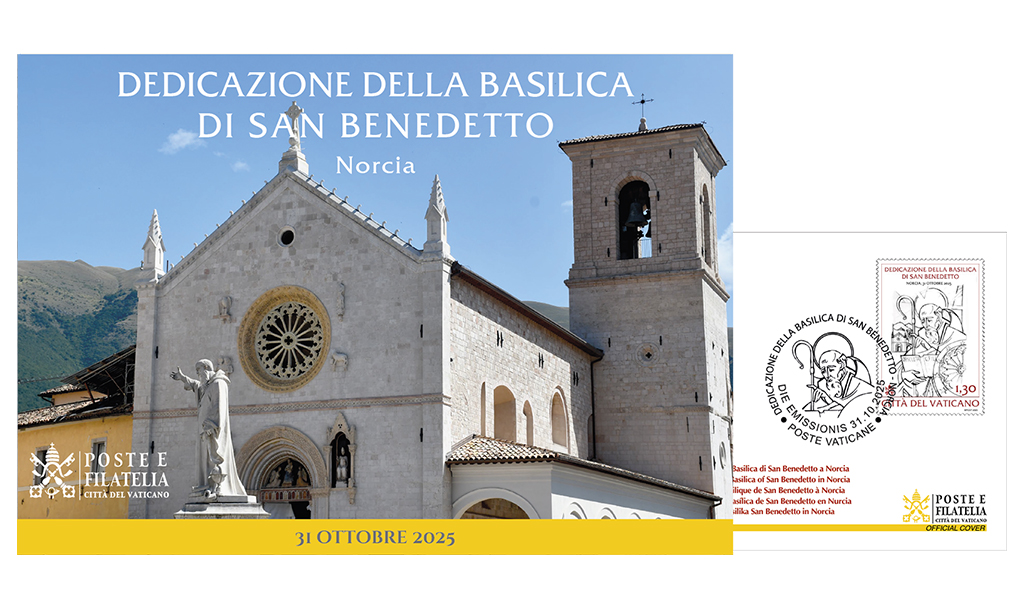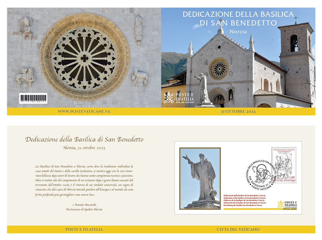 Il Servizio Poste e Filatelia del Governatorato celebra la riapertura della Basilica di San Benedetto a Norcia, ricostruita dopo i gravi danni del terremoto del 2016, con l’emissione di un francobollo e di un annullo postale speciale “Die Emissionis”.